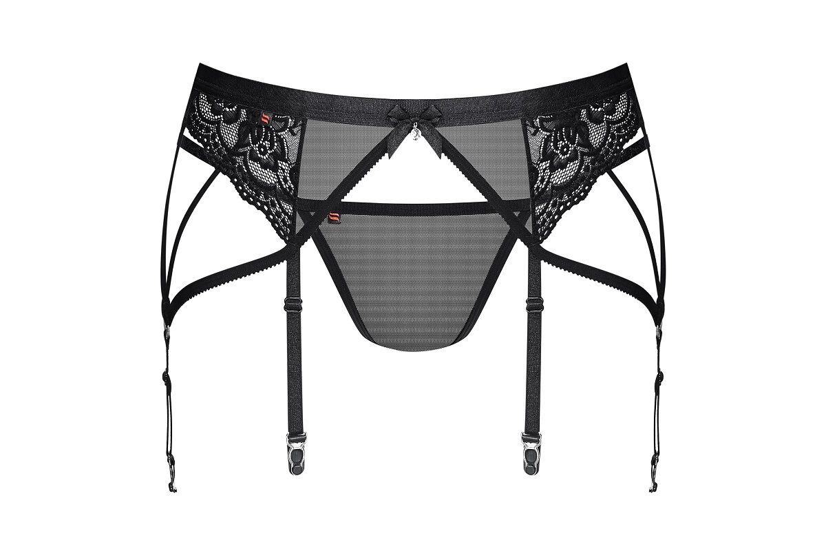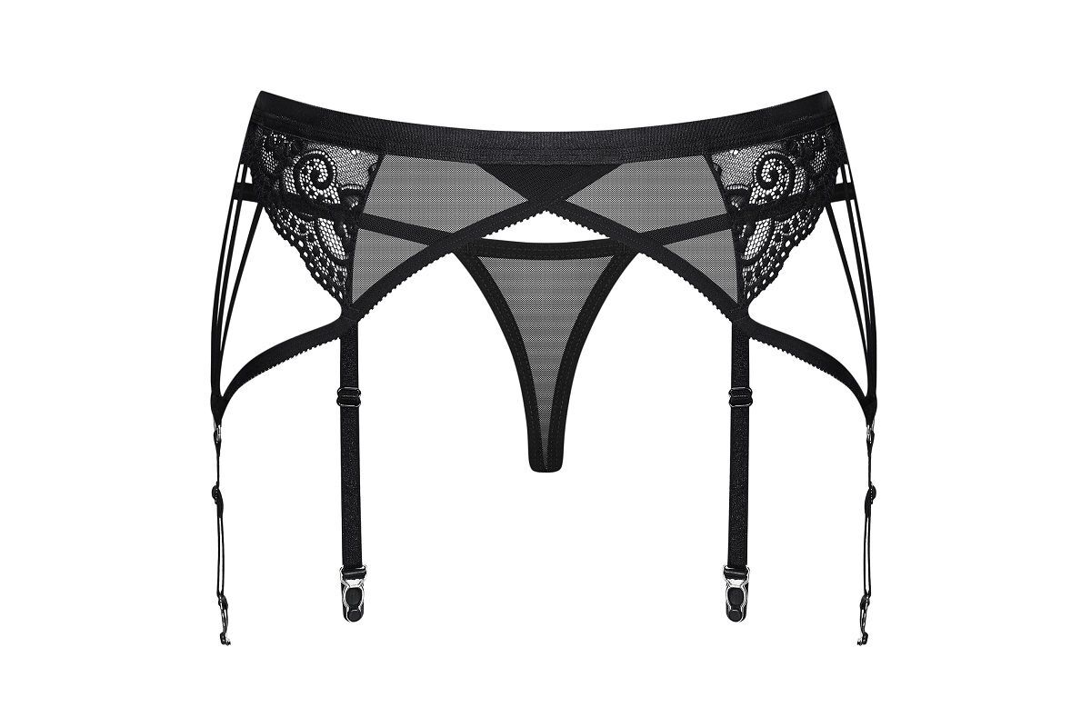 Этот роскошный пояс из цветочного кружева покорит вас своим дизайном и функциональностью. У него не классические четыре, а целых шесть точек фиксации чулок – две спереди, две сзади и по одной по бокам. Боковые пажи словно собраны из лучиков: эластичные бретели собираются в одну точку и крепятся к кольцу. Тоненький поясок не впивается в тело. Спереди пояс украшен атласным бантом и подвеской. Трусики-стринги из нежной сетки в комплекте. В комплекте: пояс, трусики-стринги.