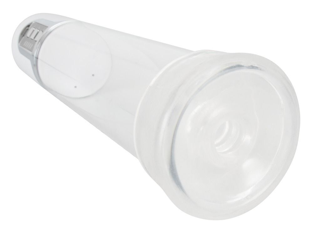 Прозрачная автоматическая вакуумная помпа для пениса с серебристой панелью управления с 3 кнопками. Помпа также имеет измерительную шкалу в сантиметрах и дюймах. Перезаряжается с помощью прилагаемого USB-кабеля. Рабочая длина - 20 см.