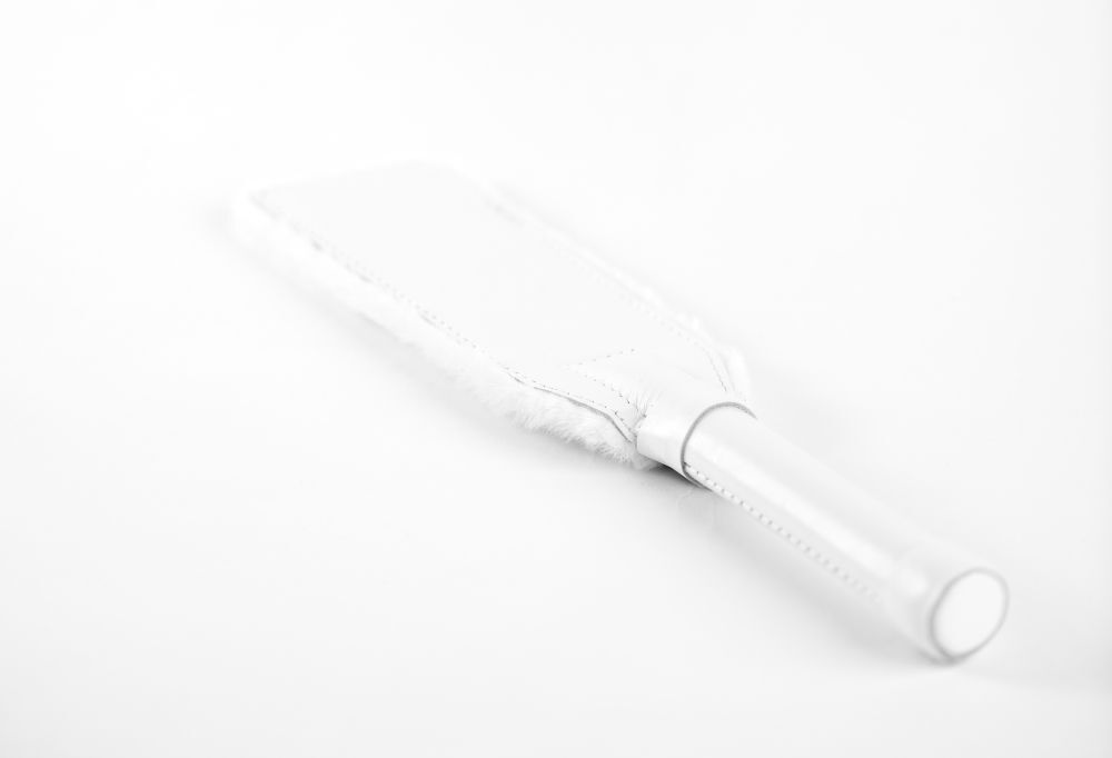 Двусторонняя шлепалка. С одной стороны выполнена из натуральной кожи белого цвета, с другой стороны нежнейший мех. Ручка из натуральной кожи максимально комфортна в руке. Шлепалка при ударе звучит громко и эффектно. Длина ручки - 13 см.