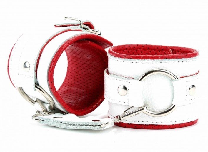 Наручники выполнены из натуральной гладкой кожи белого цвета, декорированы кольцом и металлическими заклёпками. Ремни позволяют выбрать нужный размер, подойдут на обхват руки от 16 до 25 см, металлическая пряжка крепко удерживает в подчинении. Кожаное соединение на карабинах фиксирует наручники вместе. Подклад из нежной кожи с перфорацией обеспечивает комфорт. Аксессуар принесет незабываемые яркие ощущения обоим партнерам. Ширина - 6 см. Длина соединения - 15 см. Диаметр кольца - 4 см.