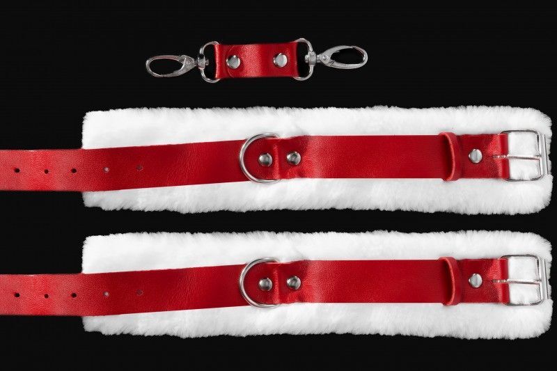 Бело-красные наручники из натуральной кожи с нежным мехом