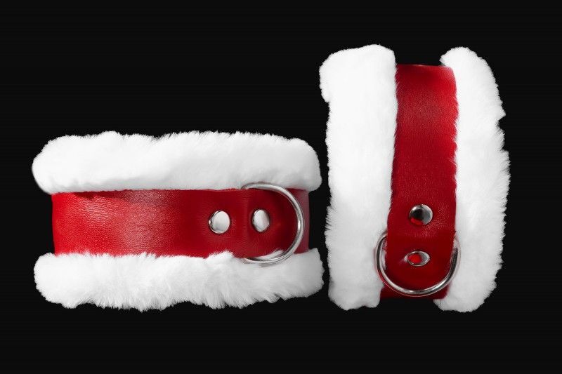 Бело-красные поножи из натуральной кожи с нежным мехом