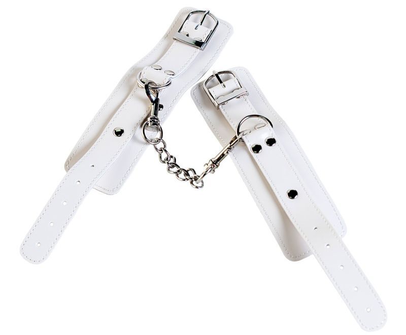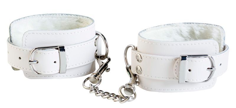 Белые кожаные наручники с мехом внутри. Между собой сцеплены 2 карабинами и цепочкой. Длина цепочки - 7 см.