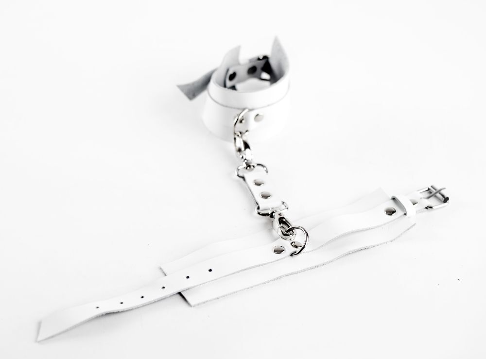 Нежные и элегантные оковы из натуральной кожи белого цвета никого не оставят равнодушным. Вся фурнитура выполнена из высококачественного металла, который гармонично сочетается с белой кожей и делает аксессуар не только функциональным, но и стильным. Натуральная кожа делает использование изделия очень комфортным. Длина удобно регулируется и подходит на обхват от 21 до 30 см. Ширина - 5 см. Длина соединения - 15 см.