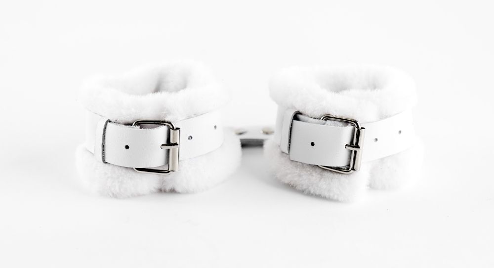 Оковы из нежнейшего белоснежного меха. Красивый и функциональный аксессуар. Ремешки выполнены из качественной натуральной кожи белого цвета. Надежная фурнитура из металла. Размер регулируется с помощью ремешков, Оковы прекрасно подойдут для окружности ноги от 15 до 30 см. Оковы созданы для надежной и в то же время нежной фиксации. Ширина - 6 см. Длина соединения - 13 см.