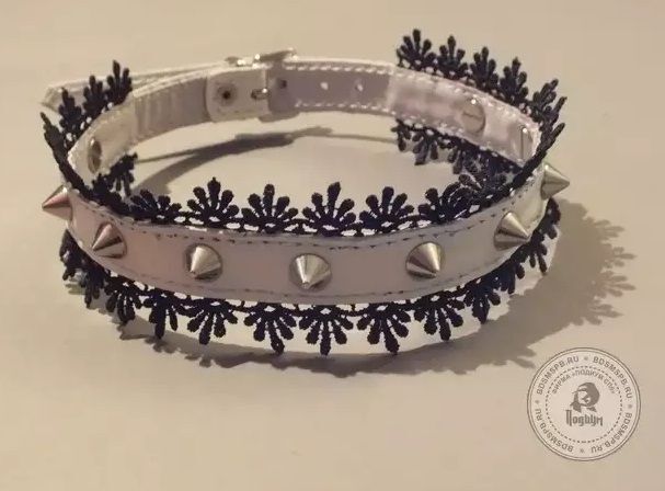Данная модель выполнена из натуральной кожи белого цвета и украшена кружевом и шипами. Ошейник - изысканный аксессуар из натуральной кожи, великолепно будет смотреться с вашим любым эротическим костюмом для сексуальных игр. Данная модель идеально подходит для повседневной носки. Размер универсальный, регулируется застежкой пряжкой. Ширина — 1,5 см.