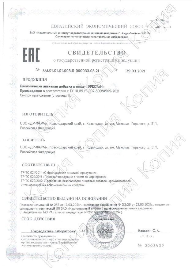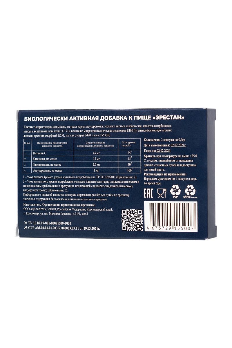 Пищевая добавка для профилактики и уменьшения эректильной дисфункции Эрестан поможет справиться с вялой и нестабильной эрекцией. Эрестан - это новый биологически активный комплекс для мужчин, направленный на устранение проблем с потенцией и стимулирование естественной половой функции. Доказанное эффективное воздействие на организм мужчины показало, что повышается выносливость, умственная и физическая работоспособность, а в период повышенного стресса и напряжения наблюдается повышение общего тонуса организма. Эрестан является дополнительным источником витамина С, гинсенозидов, элеутерозидов, катехинов. Эрестан - скорая помощь для вашей потенции, он способствует нормализации естественных половых функций. В основе Эрестана растительные экстракты, которые активируют потенцию, эффект сохраняется на протяжении 15-24 часов, не повышая при этом артериальное давление. Эффективность Эрестана не снижается даже при употреблении алкоголя. Уже через 2 часа после приема капсулы появится крепкая эрекция, без каких-либо побочных эффектов. Противопоказания: индивидуальная непереносимость компонентов продукта, детский возраст до 18 лет, повышенное артериальное давление, судорожные состояния, расстройства сна, нарушение ритма сердечной деятельности, выраженный атеросклероз, острые инфекционные заболевания. Перед применением рекомендуется проконсультироваться с врачом. Свидетельство AM.01.01.01.003.R.000033.03.21 от 29.03.2021 г. Номер бланка - 0003439.