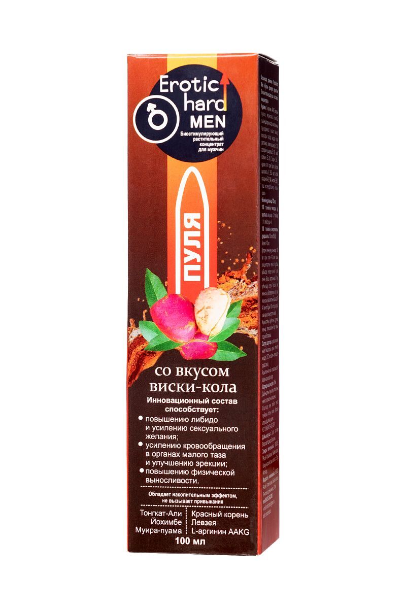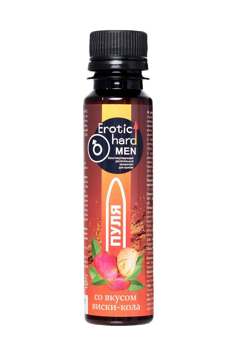 Для мужчин важно оставаться сексуально активными, здоровыми и выносливыми в любом возрасте. Биостимулирующий растительный жидкий концентрат Erotic hard Man Пуля со вкусом виски-кола разработан специально для мужчин. За счет натуральных растительных компонентов в составе, Erotic hard Man Пуля оказывает положительный эффект на работу всех основных систем организма. А мощные природные афродизиаки, усиленные L-аргинином AAKG, благотворно воздействуют на половую функцию. Концентрат со вкусом виски-кола не содержит сахара, в его составе натуральный подсластитель, при этом содержание калорий всего 1 Ккал на 100 г. Принимать его полезно для организма, ведь в 10 мл содержится максимально допустимая суточная доза активных компонентов, в отличие от сиропов. Биостимулирующий растительный жидкий концентрат для мужчин Erotic hard Man Пуля продлевают эрекцию усиливает потенцию и сексуальные ощущения стимулирует подвижность сперматозоидов и улучшает качество спермы повышает физическую выносливость нормализует уровень тестостерона снижает вероятность развития патологических изменений в предстательной железе способствует укреплению иммунитета оказывает противовоспалительное и противомикробное действие улучшает самочувствие, успокаивает и расслабляет нервную систему. Противопоказания: не рекомендуется лицам, страдающим индивидуальной непереносимостью компонентов, повышенной нервной возбудимостью, бессонницей, артериальной гипертензией не рекомендуется превышать рекомендуемую суточную норму продукта (10 мл.) не рекомендуется одновременный прием с алкоголем, т.к. снижает эффективность действующих веществ. Прием концентрата возможен за 30-40 минут до употребления алкоголя. При заболеваниях сердечно-сосудистой системы совместный прием с алкоголем исключен.