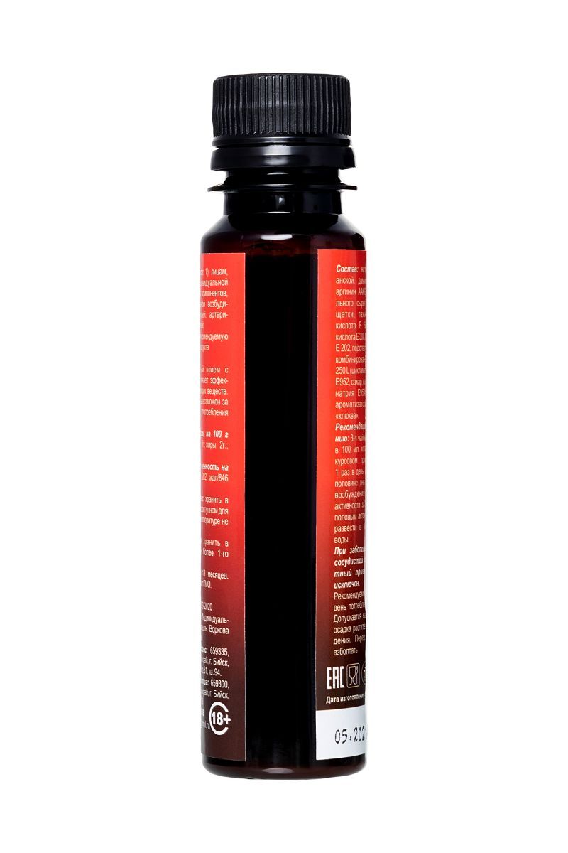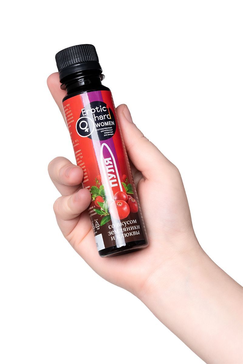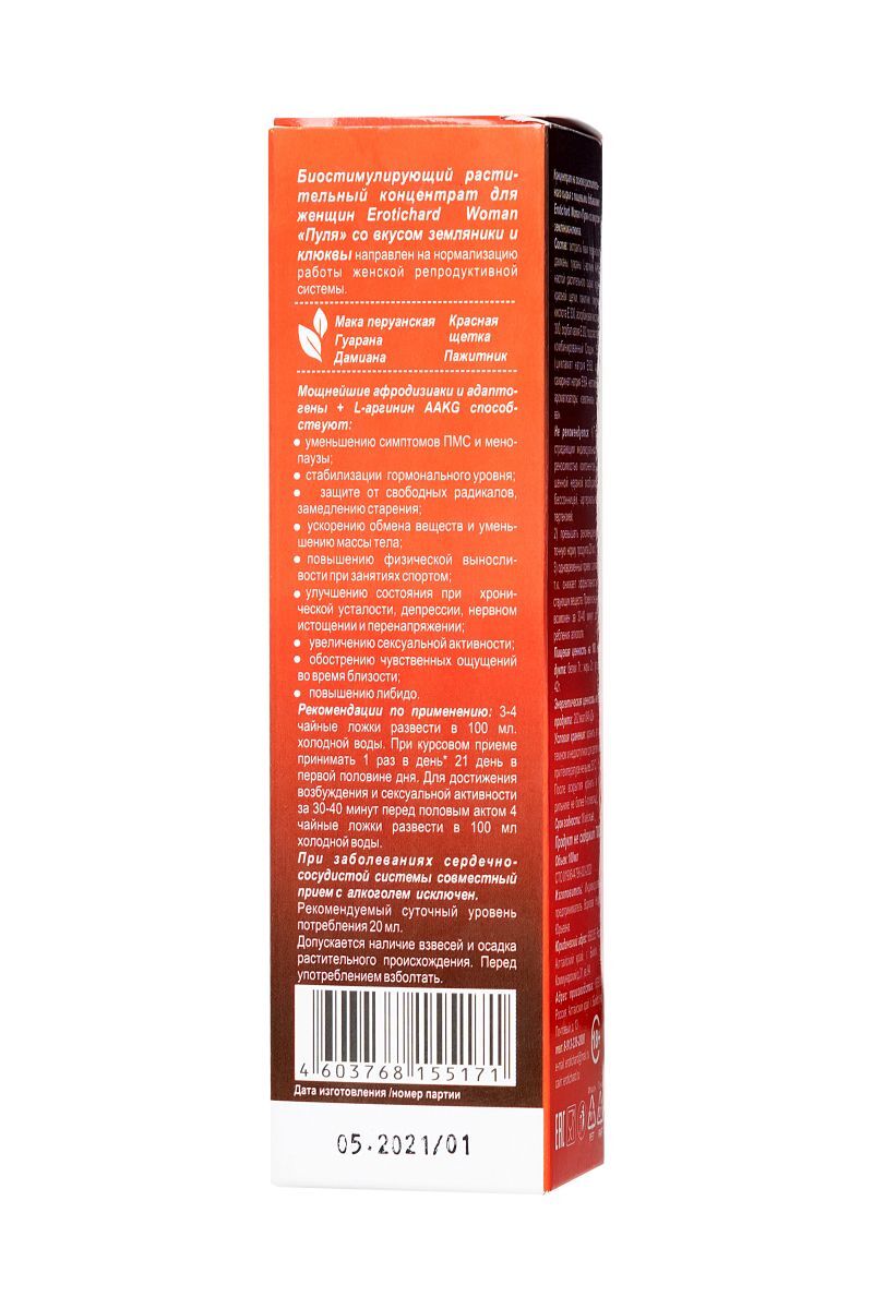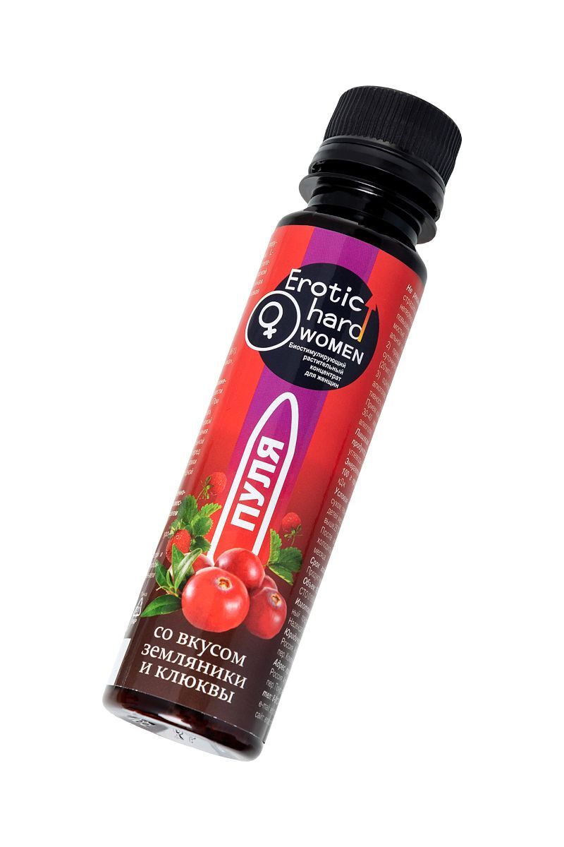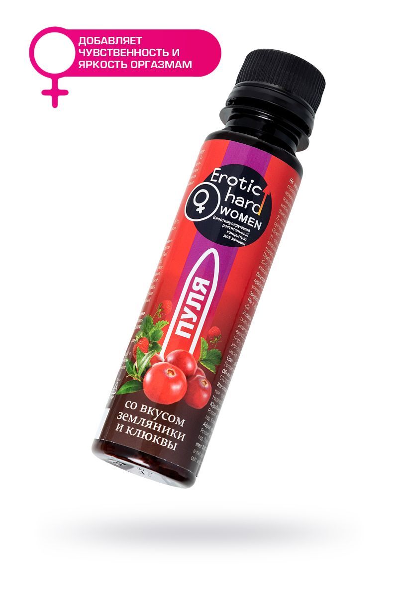 В любом возрасте женщины хотят оставаться сексуально активными, здоровыми, молодыми и привлекательными. Биостимулирующий растительный жидкий концентрат Erotic hard Woman Пуля со вкусом земляники и клюквы разработан специально для женщин. За счет натуральных растительных компонентов в составе, Erotic hard Woman Пуля оказывает положительный эффект на работу всех основных систем организма. А мощные природные афродизиаки благотворно влияют на половую функцию. Концентрат со вкусом земляники и клюквы не содержит сахара, в его составе натуральный подсластитель, при этом содержание калорий всего 1 Ккал на 100 г. Принимать его безопасно для фигуры и полезно для организма, ведь в 20 мл содержится максимально допустимая суточная доза активных компонентов, в отличие от сиропов. Биостимулирующий растительный жидкий концентрат для женщин Erotic hard Woman Пуля усиливает либидо стимулирует сексуальное влечение и возбуждение добавляет чувственность и яркость оргазмам повышает физическую выносливость нормализует гормональную систему уменьшает симптомы ПМС и менопаузы способствует укреплению иммунитета оказывает противовоспалительное и противомикробное действие улучшает самочувствие, успокаивает и расслабляет нервную систему. Противопоказания: не рекомендуется лицам, страдающим индивидуальной непереносимостью компонентов, повышенной нервной возбудимостью, бессонницей, артериальной гипертензией превышать рекомендуемую суточную норму продукта (20 мл.) не рекомендуется одновременный прием с алкоголем, т.к. снижает эффективность действующих веществ. Прием концентрата возможен за 30-40 минут до употребления алкоголя. При заболеваниях сердечно-сосудистой системы совместный прием с алкоголем исключен.