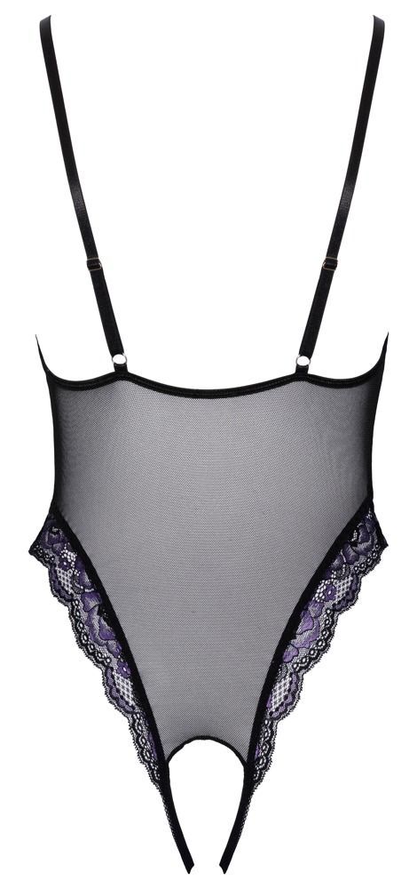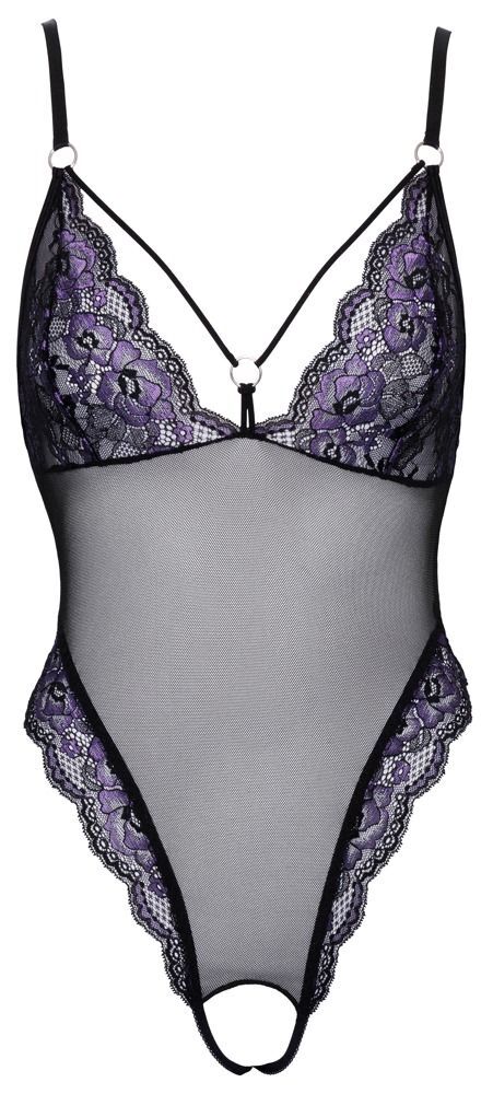 Боди из тонкой сеточки с двухцветным цветочным кружевом. Декоративные эластичные бретели у выреза горловины соединены кольцом. Ремни регулируются по размеру. Два эластичных ремня ведут через открытую промежность.