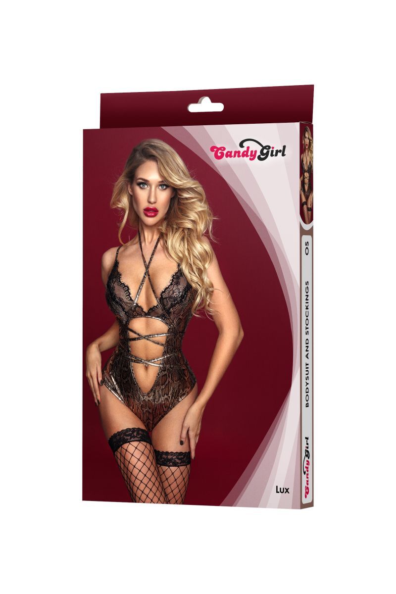 Боди Candy Girl Lux создано для того чтобы сразить партнера наповал новым эротическим образом! Облегающий крой материала wetlook подчеркивает соблазнительные изгибы тела как вторая кожа. Благородный металлический блеск змеиного принта роскошно переливается и мерцает в приглушенном свете. Кружевные вставки на бюсте акцентируют внимание на груди, а вырез в области животика открывает чувствительные зоны тела для поцелуев. Регулируемые бретели с металлической фурнитурой помогают добиться посадки по фигуре. Тонкий поясок добавляет возбуждения в процессе подготовки образа и становится дополнительным аксессуаром для игр с партнером. Чулки из крупной сетки с кружевной резинкой и усиленным мыском входят в комплект. В комплекте: боди, чулки.