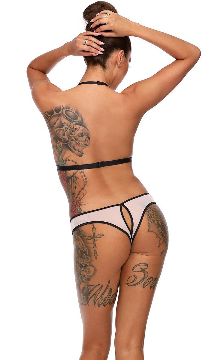 Боди-трикини из эластичной прозрачной вуали, спереди декорировано тканью с контрастным цветочным рисунком под вышивку крестиком , бретель перекидывается на шею сзади, регулируется по длине, на спине застёжка-удлинитель, ластовица открытая