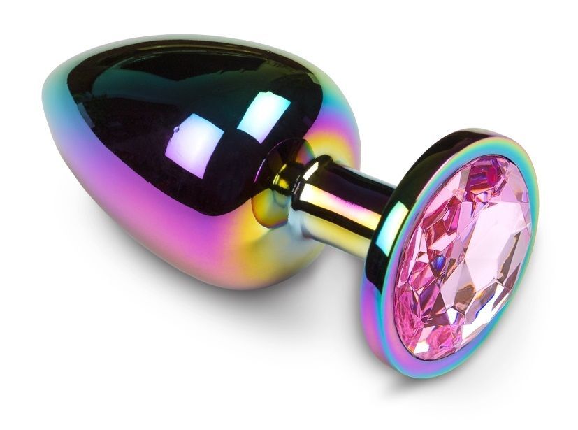 Большая радужная анальная пробка с розовым кристаллом - 8 см.