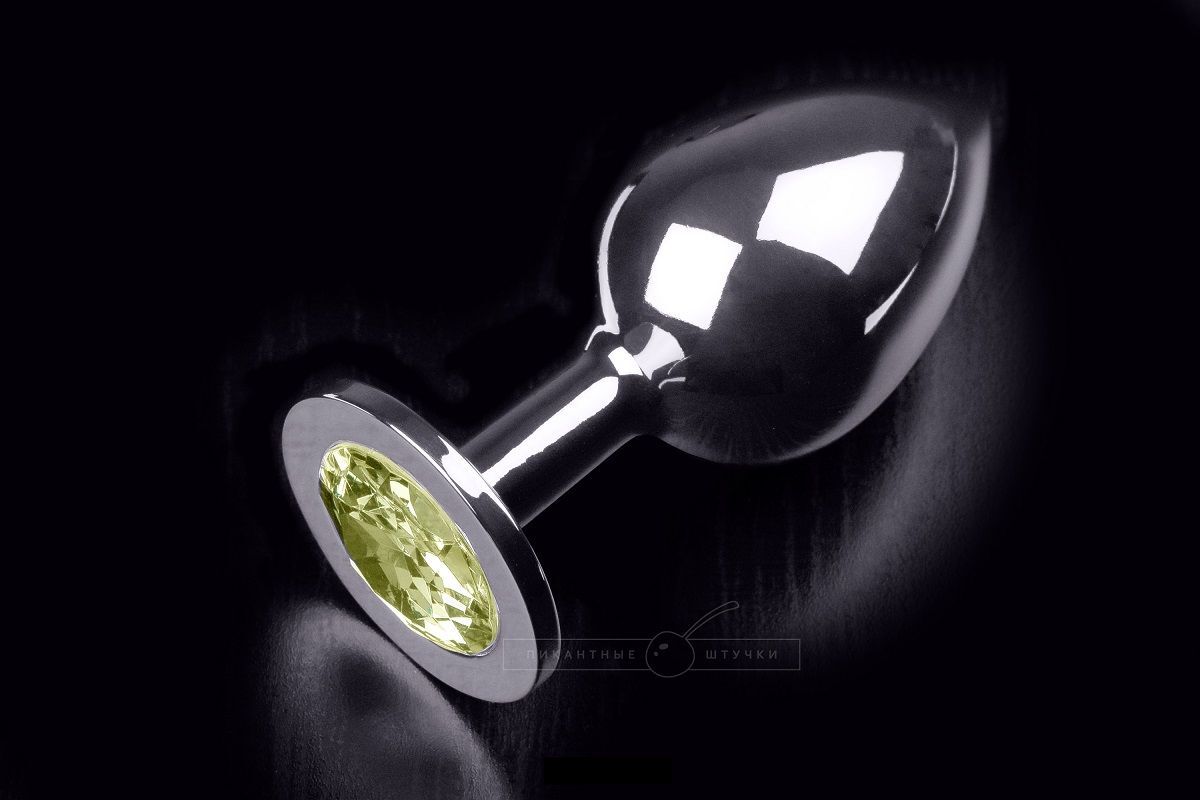 Большая серебристая анальная пробка с круглым кончиком и жёлтым кристаллом - 9 см.