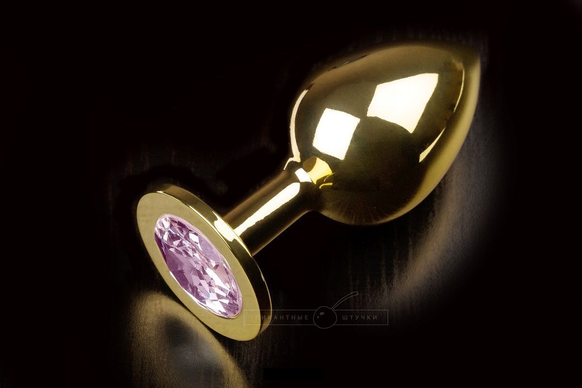 Большая золотая анальная пробка с закругленным кончиком и розовым кристаллом - 9 см.