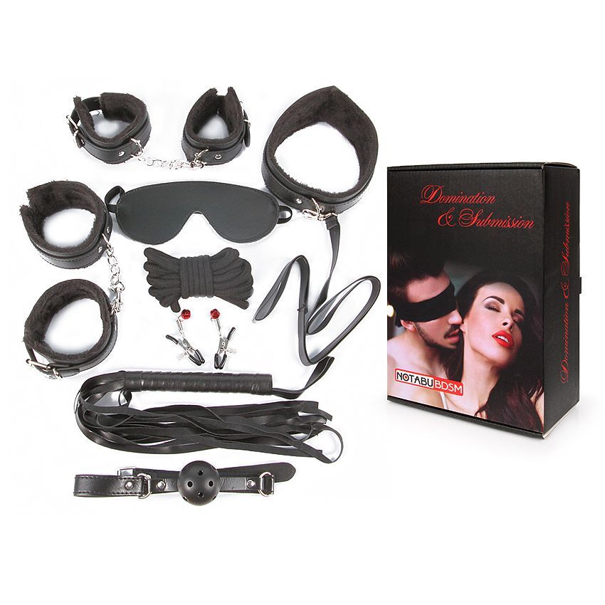 Великолепный набор аксессуаров для любителей БДСМ. В комплект входят наручники, оковы, маска, кляп, плеть, ошейник с поводком, верёвка, зажимы для сосков. Кляп, наручники, оковы, ошейник и маска снабжены мягкой внутренней подкладкой, предотвращающей натирание кожи. Также изделия имеют возможность регулирования размера. Плеть-флогер состоит из хвостов и удобной рукоятки. Кляп оснащен шариком с отверстиями для дыхания. В комплекте: наручники, оковы, маска, кляп, плеть, ошейник с поводком, верёвка, зажимы для сосков.