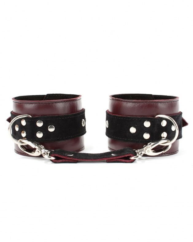 Наручники выполнены из натуральной кожи цвета бордо. Изделие декорировано ремнями из замши черного цвета. Обратная сторона изделия тоже выполнена из черной замши. По середине наручника расположено полукольцо из сварной фурнитуры. Наручники надежно фиксируются пряжками и ремнями, позволяющими выбрать нужный размер, подойдут на обхват руки от 16 до 25 см. Кожаное соединение на карабинах фиксирует наручники вместе. Стильные наручники отлично подходят для воплощения эротических БДСМ игр. Ширина - 6 см. Длина соединения - 18 см.