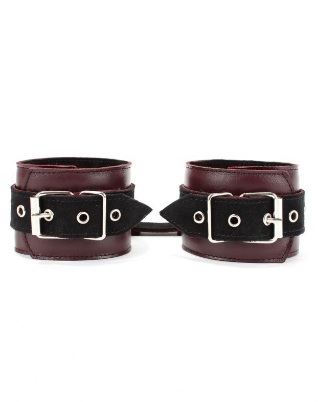 Оковы выполнены из натуральной кожи цвета бордо. Изделие декорировано ремнями из замши черного цвета. Обратная сторона изделия тоже выполнена из черной замши. По середине аксессуара расположено полукольцо из сварной фурнитуры. Оковы надежно фиксируются пряжками и ремнями, позволяющими выбрать нужный размер, подойдут на обхват от 20 до 29 см. Кожаное соединение на карабинах фиксирует оковы вместе. Стильный аксессуар отлично подходят для воплощения эротических БДСМ игр. Ширина - 6 см. Длина соединения - 20 см.