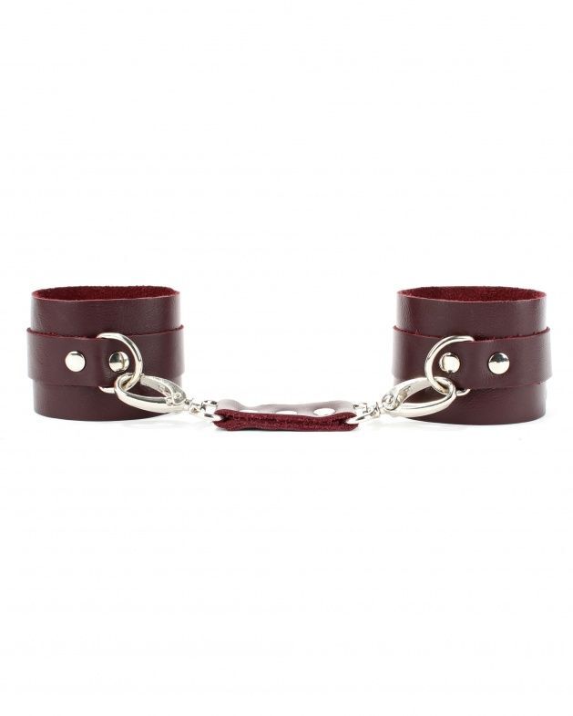 Оковы выполнены из натуральной кожи бордового цвета. Металлическая пряжка крепко удерживает в подчинении, кожаное соединение на карабинах фиксирует наручники вместе. Ремни позволяю выбрать нужный размер, подойдут на обхват ноги от 20 до 30 см. Стильный аксессуар поможет воплотить эротические фантазии в реальность. Ширина - 6 см. Длина соединения - 15 см.