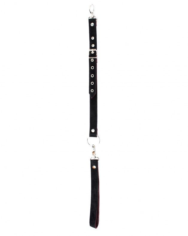 Поводок с одной стороны выполнен из натуральной кожи бордового цвета, с другой стороны из черной замши. На одном конце имеется петелька для руки. Длина изделия регулируется металлической пряжкой и ремешком от 60 до 70 см, карабины и кольцо надежно фиксируют в подчинении, обеспечивая погружение в сладкий мир ограничений. Ширина ремешка - 2 см.