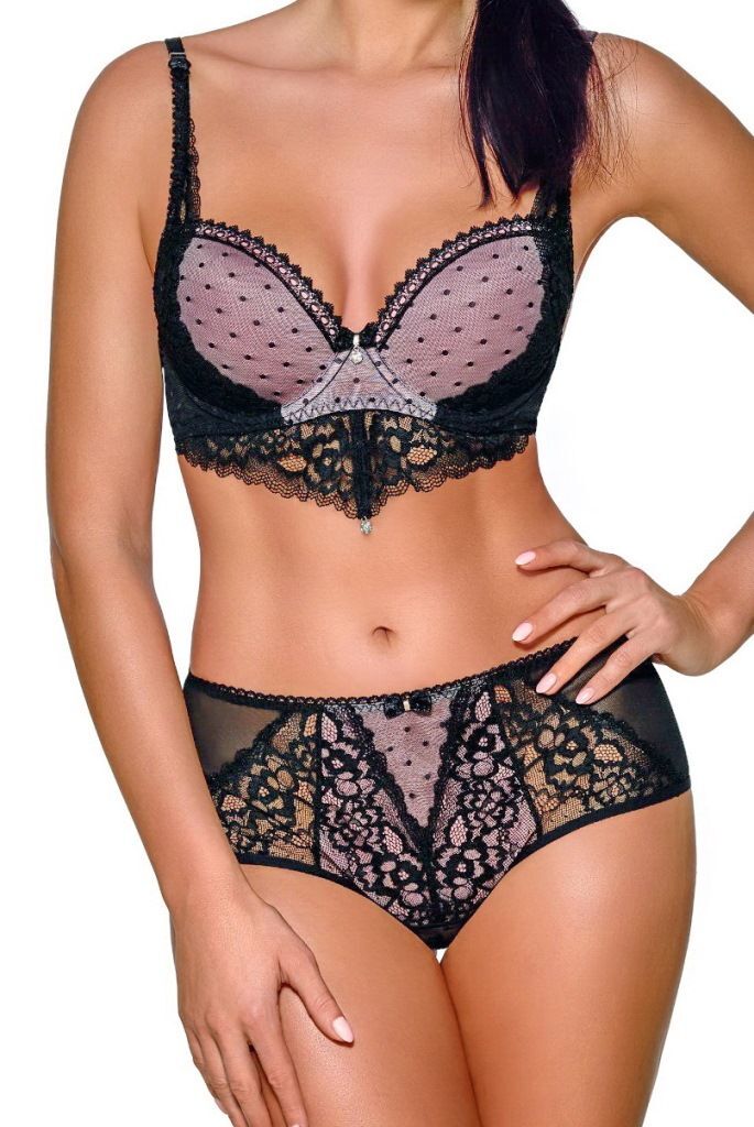 Бюстгальтер пуш-ап - чашки формованные телесного цвета, на косточках, внешняя сторона покрыта чёрной сеткой в горошек и кружевом. Бретельки не отстёгиваются, регулируются по длине. На спине застёжка на удлинитель, количество крючков в ряду застёжки увеличивается пропорционально размеру бюстгальтера. У бюстгальтеров/купальных лифов AVA довольно тугой пояс, который адаптируется под тело после нескольких дней носки или одной-двух стирок. Рекомендуем использовать удлинитель пояса бюстгальтера на первое время либо выбирать следующий за «своим» размер, с поясом длиннее.