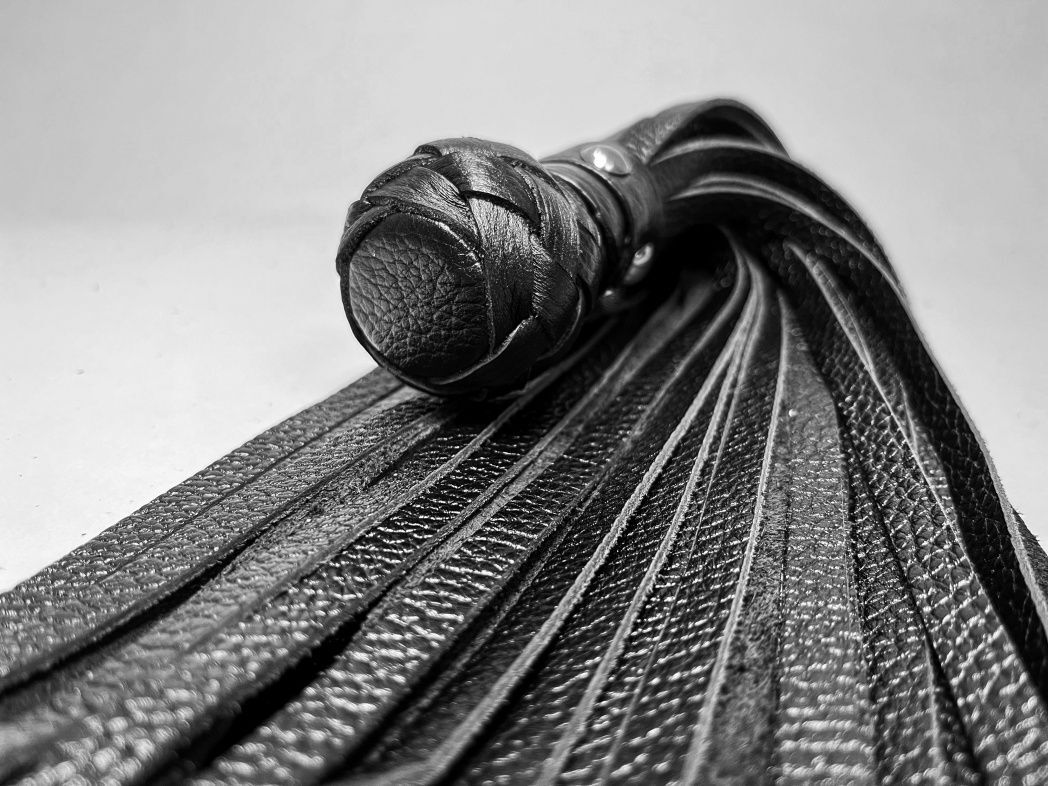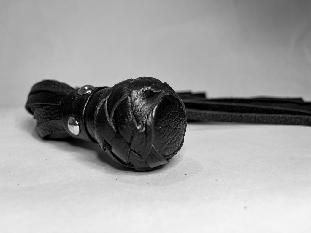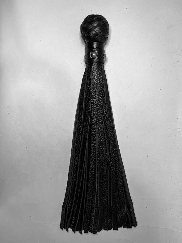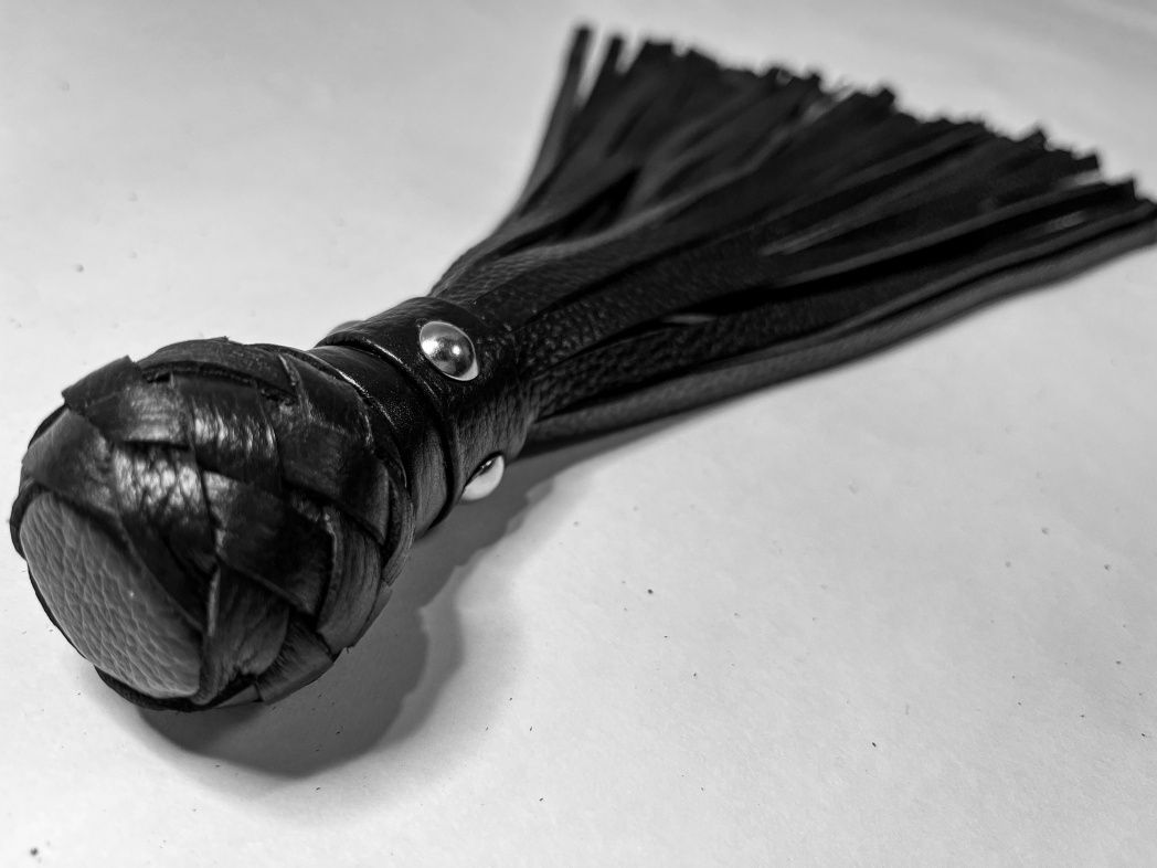 Изящная генитальная плеть, выполненная из натуральной кожи чёрного цвета. Мини-рукоятка декорирована плетением и металлической фурнитурой, очень комфортно ложится в руку! Плеть очень красивая, стоит только взять ее в руки, и уже не хочется отпускать. Эта малышка добавит огня и новых впечатлений в любовную игру!
