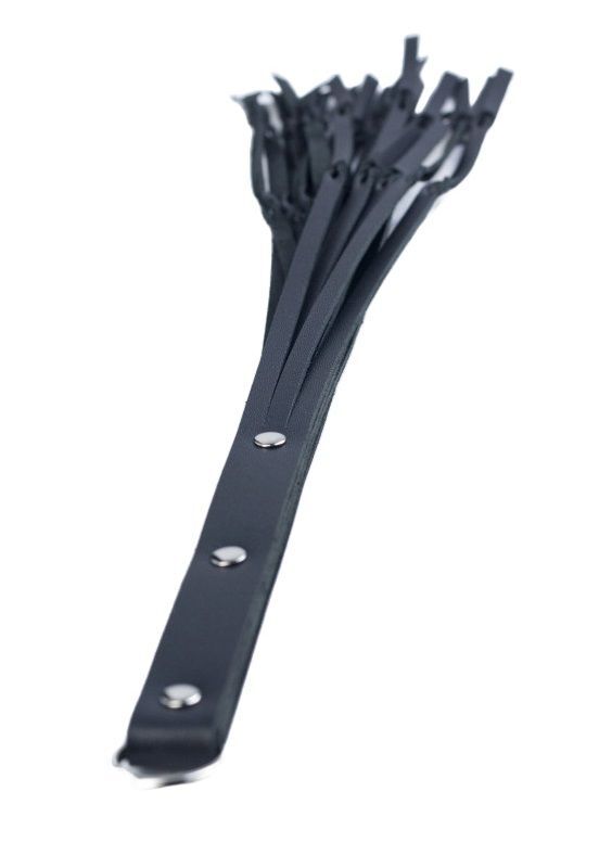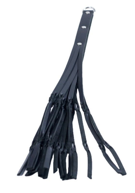 Кожаная плетка с 18 длинными хвостами. Особенности: - черная натуральная кожа (1.8-2 мм) - ручка из 6 слоев кожи, плотная и хорошо лежит в руке - 18 длинных хвостов, перекрученных у конца для большего эффекта - полукольцо в ручке для подвешивания или петли - никелированная металлическая фурнитура.