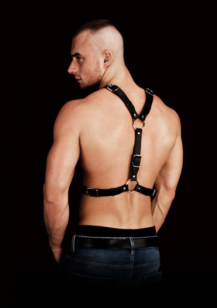 Черная мужская портупея Thanos Chest Centerpiece с большим уплотнительным кольцом посередине груди, которое опоясывает торс. Портупея декорирована заклепками, по обеим сторонам этого центрального элемента расходятся еще два уплотнительных кольца, которые соединяются под мышками и на плечах. Оба плечевых ремня имеют прочные застежки.
