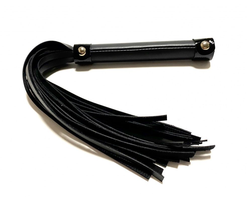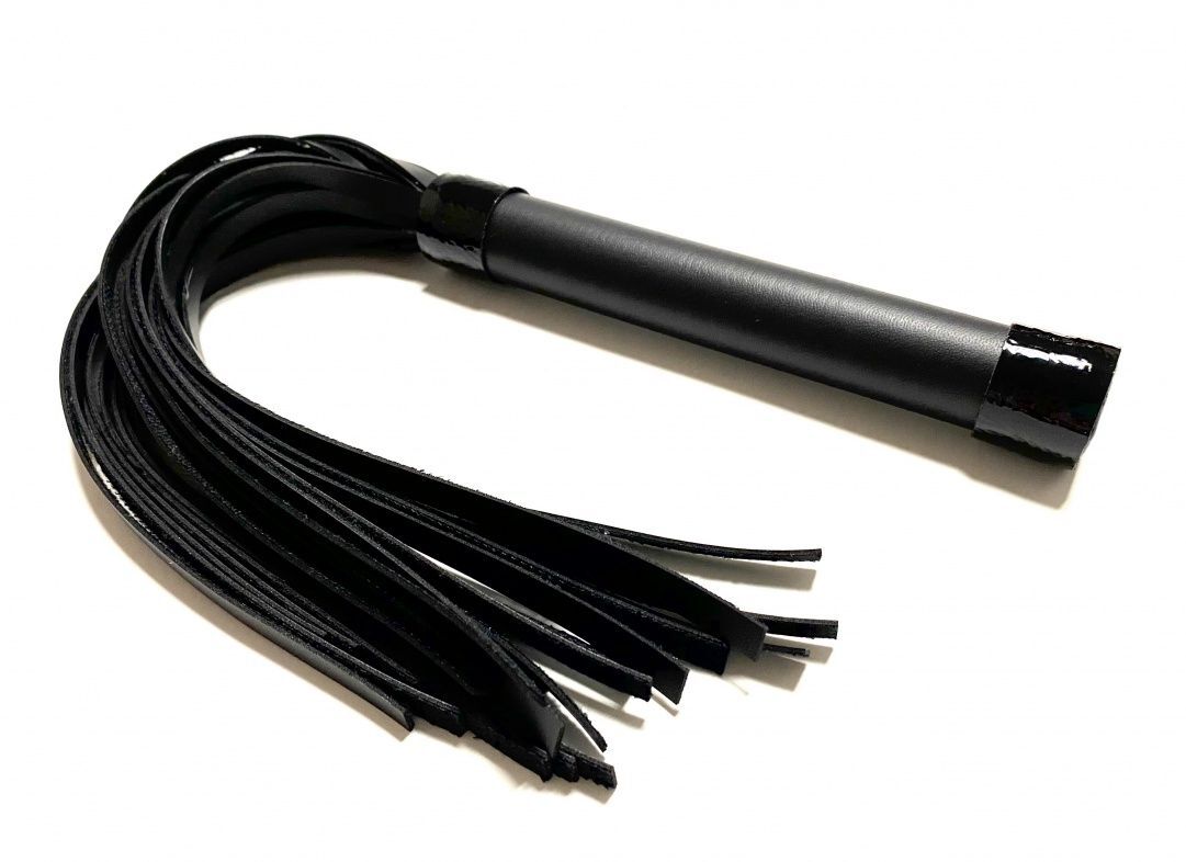 Стильная лаконичная плеть, выполненная из чёрной матовой эко-кожи. Рукоятка декорирована лаковыми полосками. Эта плеть поможет разнообразить вашу БДСМ игру и подарит новые ощущения. Экономичный, экологичный и красивый аксессуар!