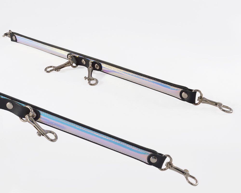 Распорка незаменимый аксессуар, который поможет ограничить подвижность и зафиксировать Вас или Вашего партнера в нужном положении для достижения максимального удовольствия. Девайс состоит из жесткой основы, которая покрыта натуральной кожей и украшена декоративной серебристой вставкой. На основании располагаются 4 карабина для фиксации наручников и оков. Никелированная фурнитура обеспечивает более долгий срок службы изделия и сохраняет декоративные свойства (может отличаться от фото). Длина распорки - 45-50 см.