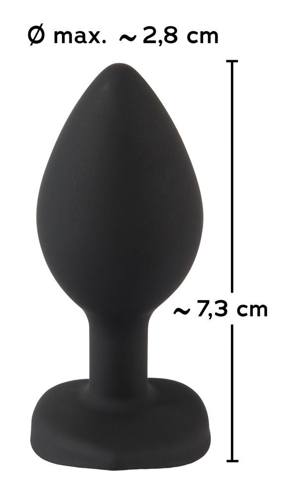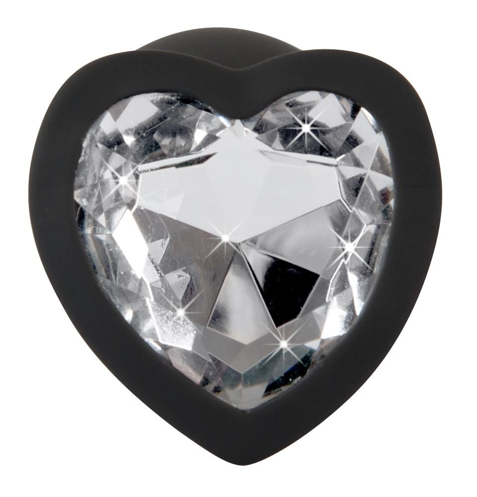 Черная силиконовая анальная пробка с прозрачным стразом-сердечком - 7,3 см.