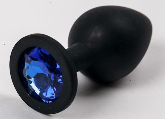 Черная силиконовая анальная пробка с синим стразом - 8,2 см.