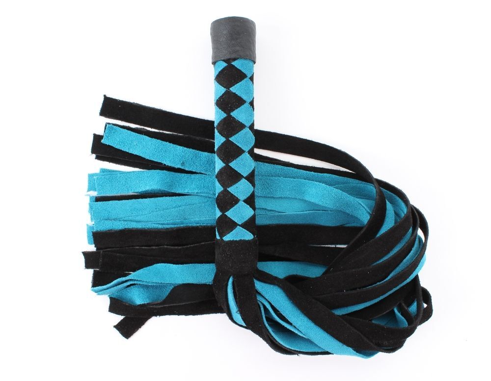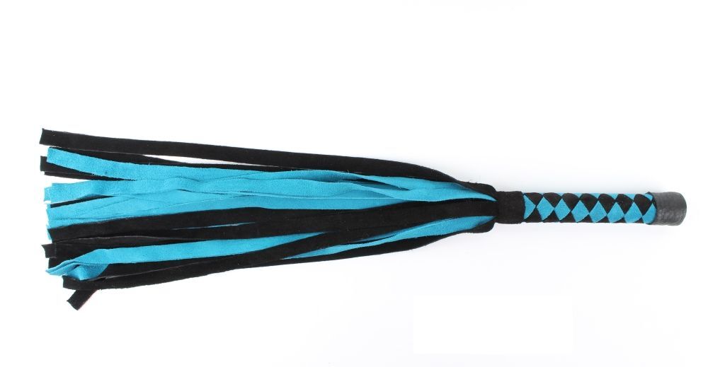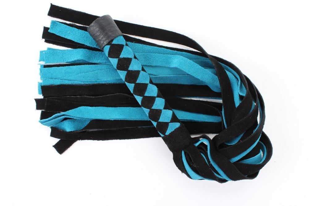 Плеть выполнена из натуральной замши черного и бирюзового цветов. Рукоятка украшена шахматным плетением. Длинные широкие хвосты делают аксессуар эффектным. Количество хвостов - 24 штуки. Возбуждающая воображение плеть поможет воплотить задуманное в реальность. Длина хвостов - 40 см. Длина рукояти - 16 см.