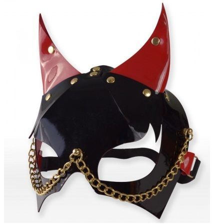 Маска дьяволенка из черной и красной натуральной лаковой кожи с миндалевидными прорезями для глаз, украшенная металлическими заклёпками и цепочкой золотистого цвета. Для максимального комфорта маска имеет бархатистую велюровую подкладку, обеспечивающую приятные тактильные ощущения при соприкосновении с кожей лица. Фиксирующая резинка с пряжкой позволяет легко регулировать размер изделия.