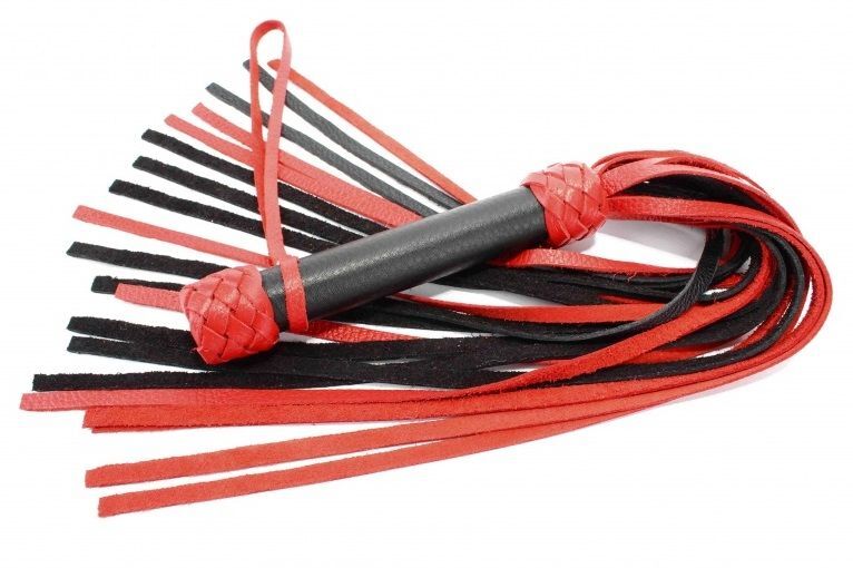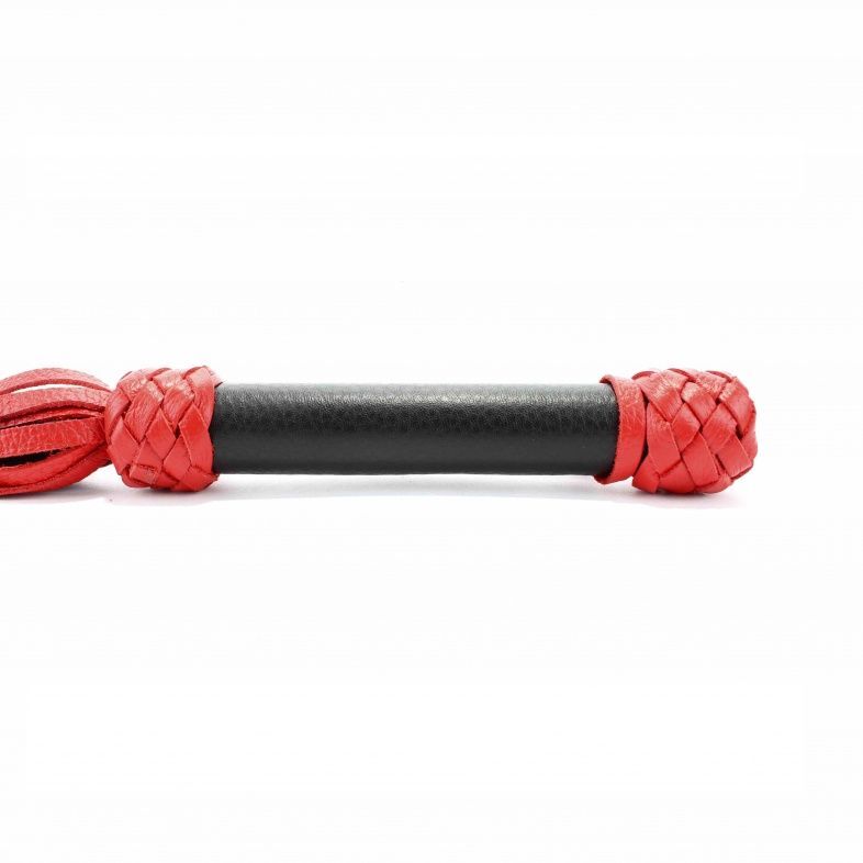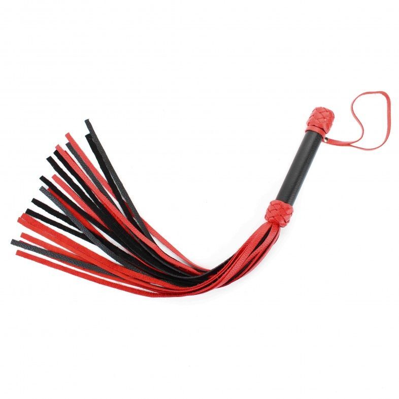 Плеть выполнена из натуральной кожи черного и красного цветов. Гладкая ручка декорирована по краям кожаным плетением. Мягкие хвосты плети доставят незабываемое впечатление. Количество хвостов - 20 штук. Для удобства на рукоятке имеется петелька . Аксессуар позволяет в полной мере насладиться сексом в стиле БДСМ. Длина рукояти - 17 см.