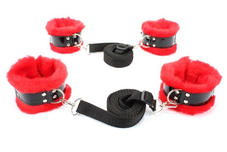 Набор для связывания состоит из наручников и оков, выполненных из красного эко-меха с лакированными черными ремнями из натуральной кожи. Также в комплект входят 2 бондажных ремня с карабинами. Аксессуары фиксируются на теле при помощи ремней и металлических пряжек, нежный мех сделает пребывание в образе максимально комфортным. Наручники подойдут на обхват от 18 до 27 см, наножники подойдут на обхват от 20 до 30 см. Бондажные ленты можно регулировать по длине от 110 до 220 см, их ширина 2 см. Не ограничивай себя во власти или получай удовольствие от сладких ограничений!