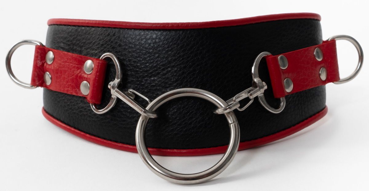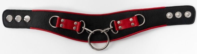 Ошейник изготовлен из искусственной кожи. Декорирован центральным кольцом и кольцами по бокам.