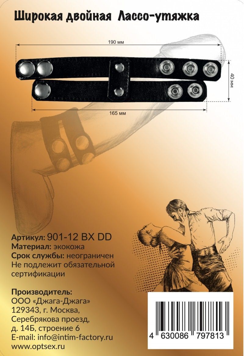 Лассо-утяжка из экокожи. Двойной ремень обеспечивает более плотный обхват, за счет чего эрекция достигается быстрее, и время интимной близости существенно продлевается. Легко и удобно удерживается на месте с помощью металлических кнопок. Для большего кольца есть три варианта фиксации, для меньшего – два. Длина дополнительных колец - 16,5 см. Минимальный диаметр - 3,8 см.