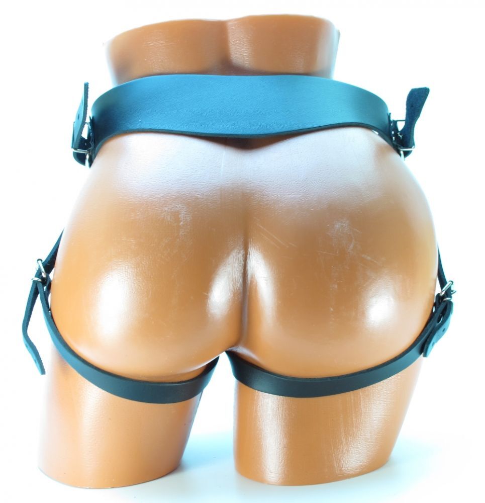 Трусы выполнены из ременной натуральной кожи черного цвета. Благодаря ремням и пряжкам можно легко менять насадки. Размер изделия легко подобрать под фигуру, перестегнув ремни сзади и по бокам, максимальный обхват в талии 110 см. Аксессуар для настоящих любителей секса в стиле БДСМ! Ширина пояса - от 5 до 7см. Ширина ремешков для фиксации - 2 см.
