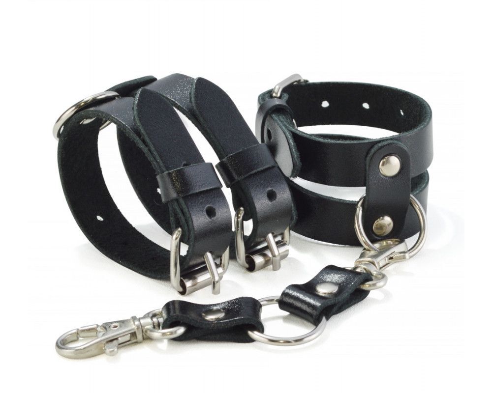 Наручники изготовлены из ременной кожи. Фурнитура никелированная. Регулируется при помощи пряжки. Наручники имеют кожаную перемычку с двумя карабинами.