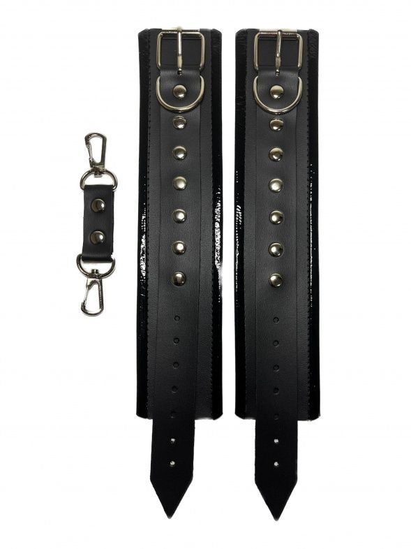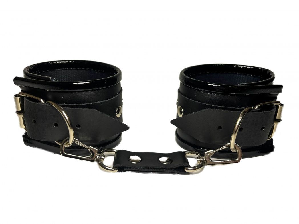 Красивые и функциональные наручники черного цвета, выполненные из искусственной кожи. Декорированы металлической фурнитурой и лаковыми вставками по краям. Обхват удобно регулируется с помощью пряжек. В комплекте идет соединение с карабинами. Очень экономичный, экологичный и практически незаменимый аксессуар для вашей любовной игры! Ширина - 5,5 см. Длина соединения - 11 см.