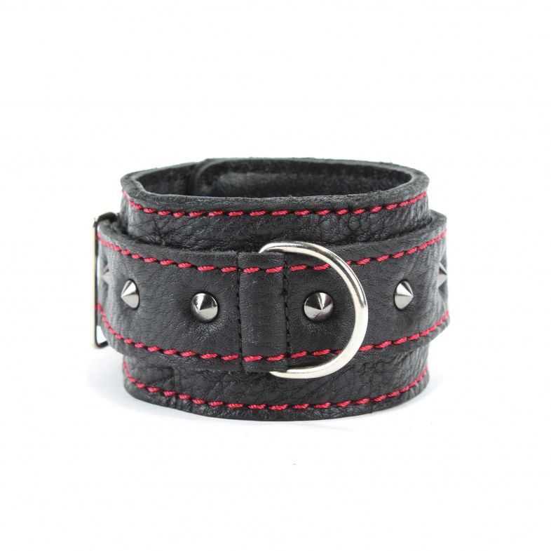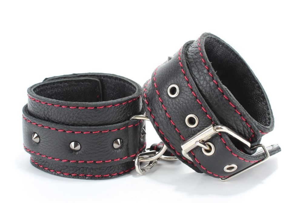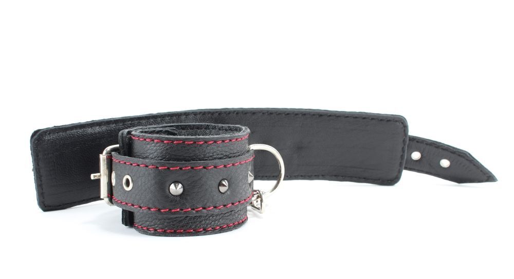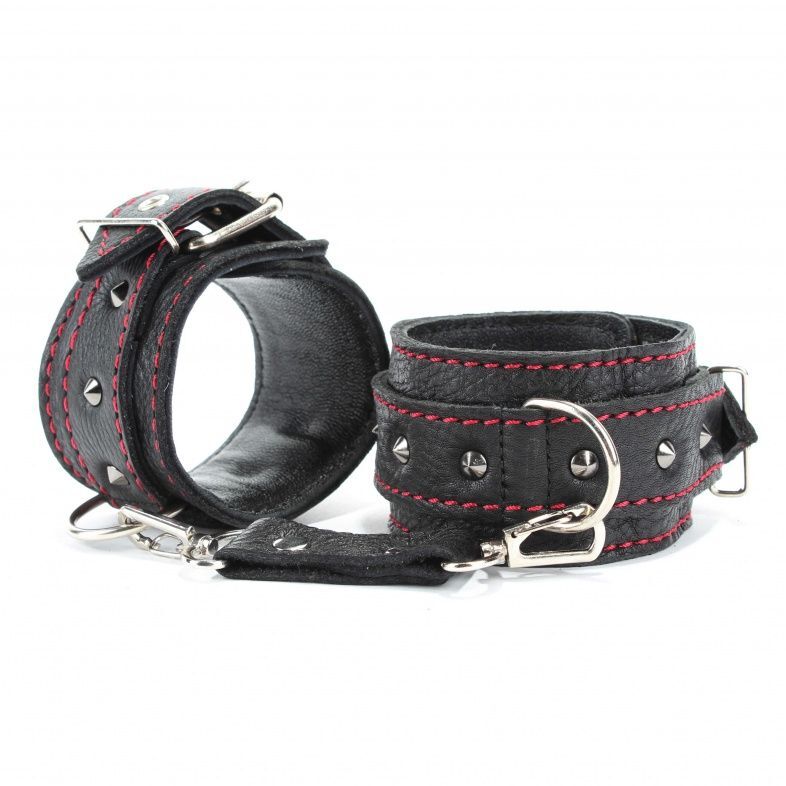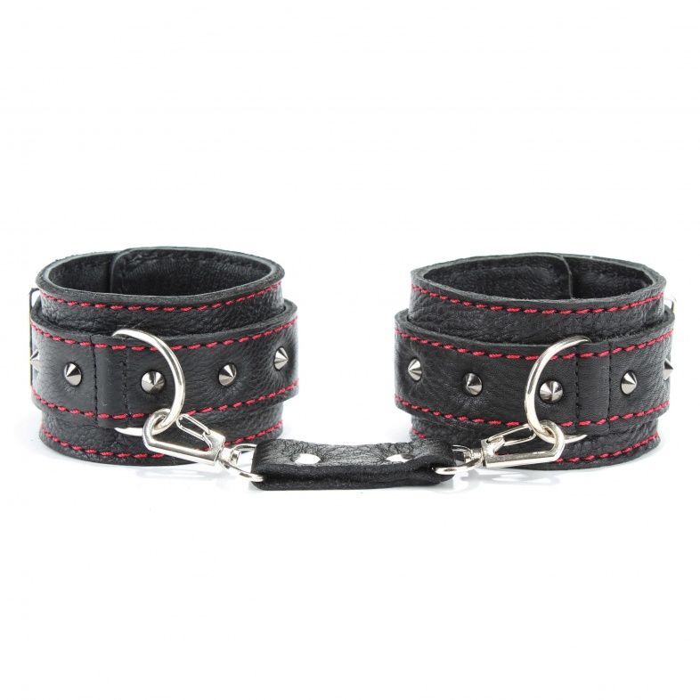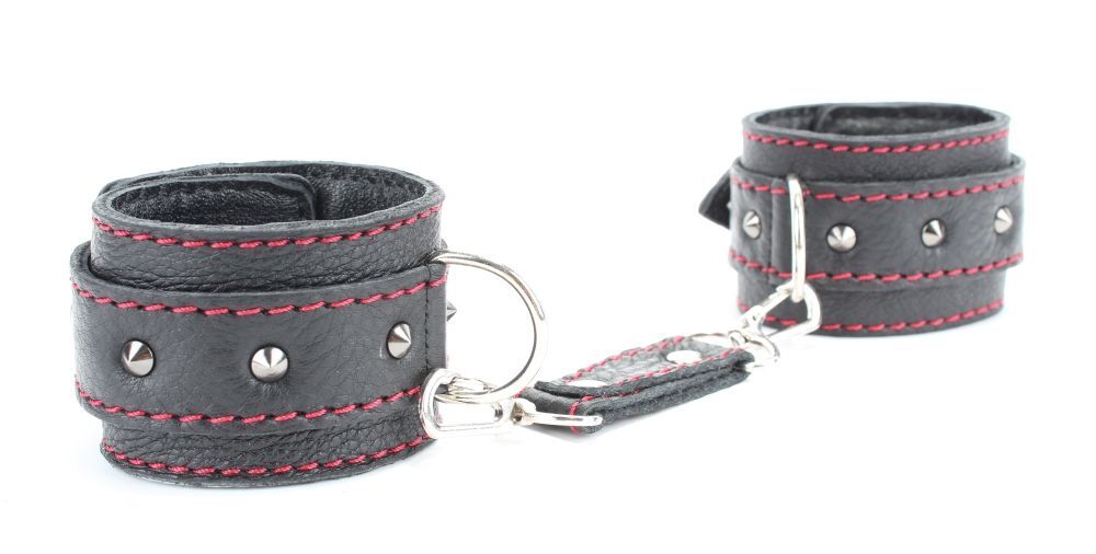 Наручники выполнены из черной натуральной кожи с красной контрастной строчкой. На ремнях украшение в виде металлических шипов. Наручники надежно фиксируются пряжками и ремнями, позволяющими выбрать нужный размер, подойдут на обхват руки от 17 до 26 см. Кожаное соединение на карабинах фиксирует наручники вместе. Аксессуар позволяет в полной мере насладиться сексом в стиле БДСМ. Ширина - 5 см. Длина соединения - 15 см.