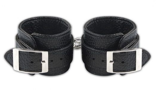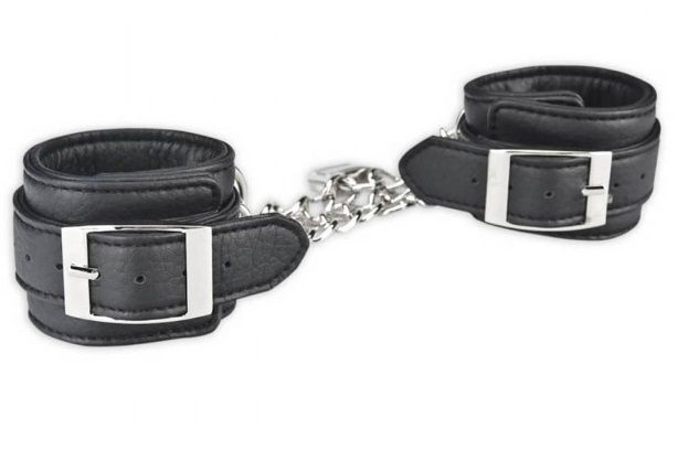 Черные оковы для запястий из качественной искусственной кожи. Все швы прострочены, металлические детали надежно закреплены. Два браслета соединяются между собой металлической цепью с прочным замком. Размер браслетов регулируется ремешком. Ширина манжет - 5 см.