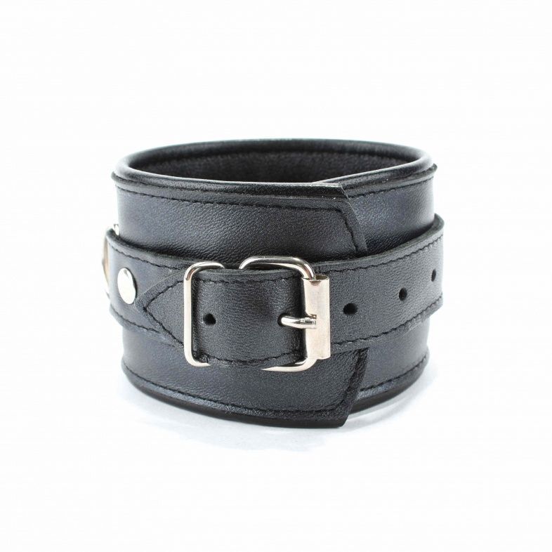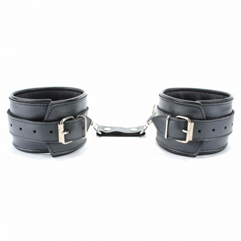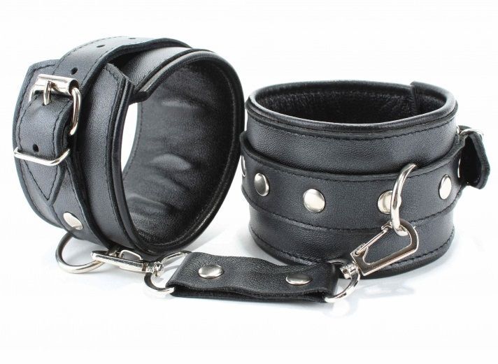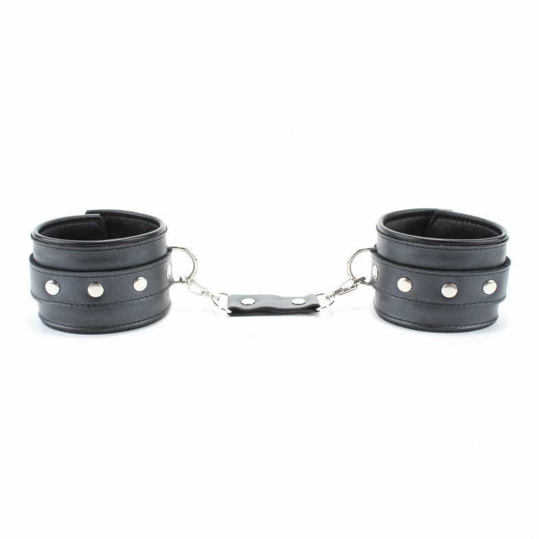 Оковы выполнены из гладкой черной натуральной кожи. Изделие декорировано металлическими заклёпками. Оковы надежно фиксируются пряжками и ремнями, позволяющими выбрать нужный размер, подойдут на обхват от 15 до 27 см. Кожаное соединение на карабинах фиксирует оковы вместе. На каждом аксессуаре полукольцо из сварной фурнитуры. Подклад выполнен из нежной перчаточной кожи. Стильные оковы помогут воплотить эротические фантазии в реальность. Ширина - 6 см. Длина соединения - 14 см.