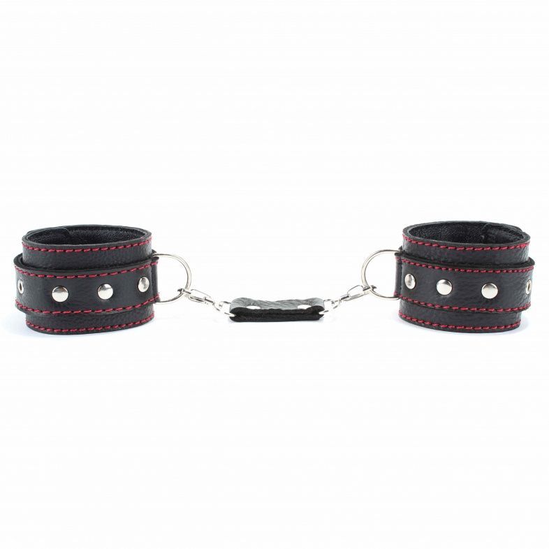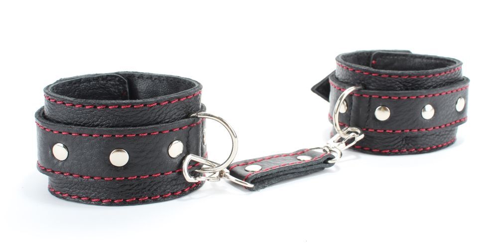 Оковы выполнены из черной натуральной кожи с красной контрастной строчкой. На ремнях украшение в виде металлических холнитенов. Оковы надежно фиксируются пряжками и ремнями, позволяющими выбрать нужный размер, подойдут на обхват от 18 до 27 см. Кожаное соединение на карабинах фиксирует оковы вместе. Аксессуар позволяет в полной мере насладиться сексом в стиле БДСМ. Ширина - 5 см. Длина соединения - 12 см.