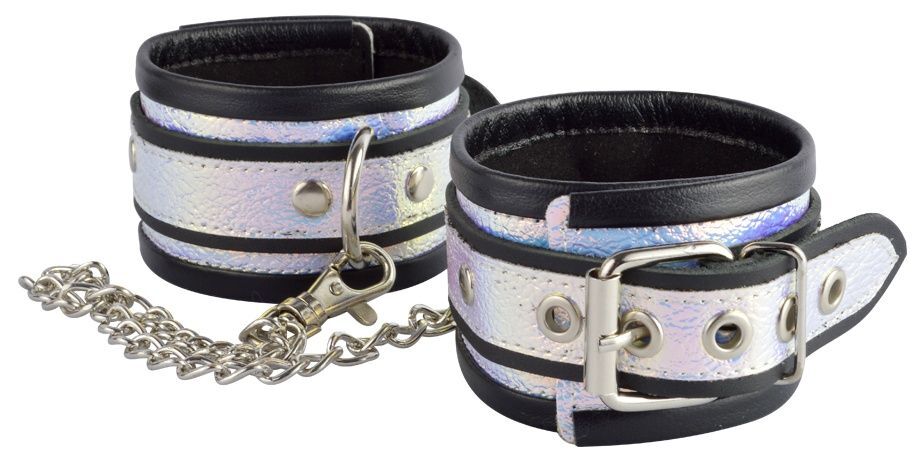 Оковы из натуральной черной кожи, с декоративной голографической отделкой из искусственной кожи. Подогнать изделие по размеру можно при помощи пряжек. Соединяются оковы цепочкой с двумя карабинами.