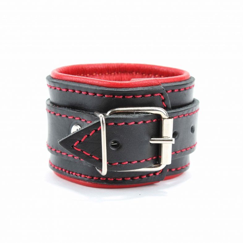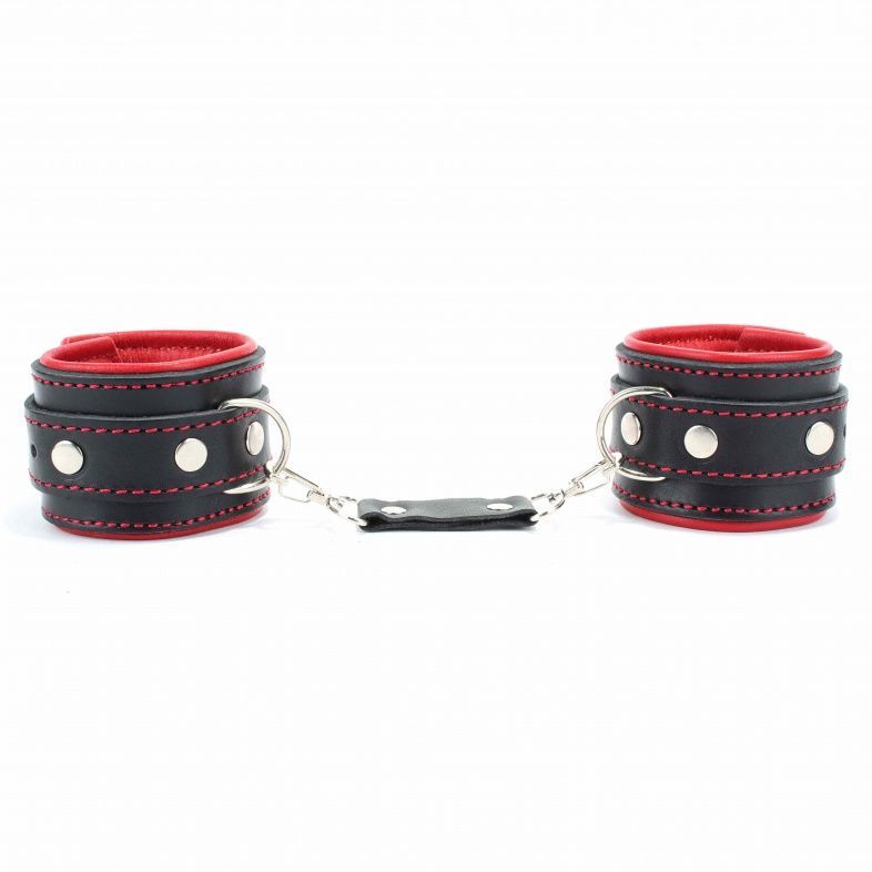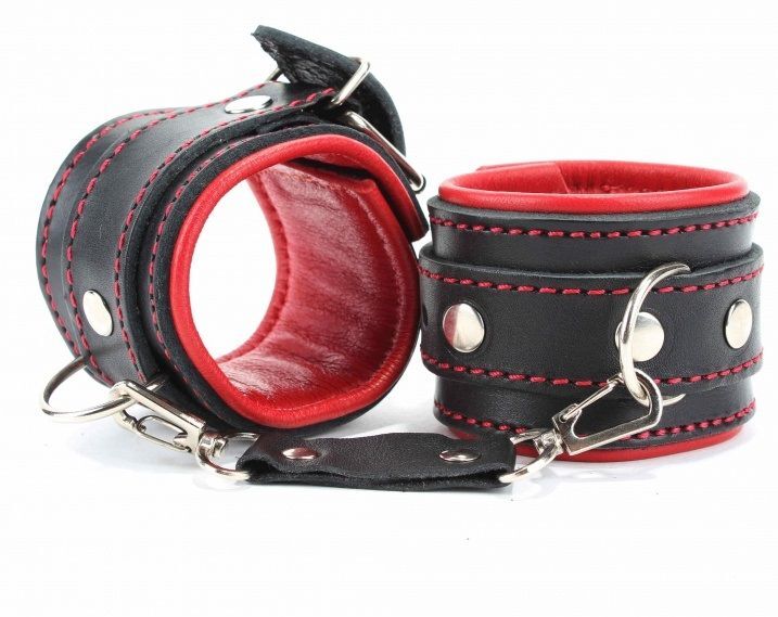 Оковы выполнены из толстой ременной кожи с подкладном из ярко-красной перчаточной кожи. Аксессуар декорирован красной строчкой. Металлическая пряжка крепко удерживает в подчинении, кожаное соединение на карабинах фиксирует оковы вместе. Ремни позволяют выбрать нужный размер, подойдут на обхват от 19 до 25 см. Мягкий подклад обеспечивает комфорт, помогая полностью погрузиться в БДСМ игру. Ширина - 6 см. Длина соединения - 14 см.