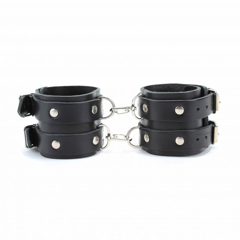 Оковы выполнены из прочной плотной натуральной кожи, надежно фиксируются ремнями с металлическими пряжками. На каждом аксессуаре расположено по два ремешка, по одному полукольцу и по одному карабину, благодаря которым оковы соединяются между собой. Наножники для ценителей жесткой и сильной фиксации. Подойдут на обхват от 19 до 27см. Ширина - 7 см.