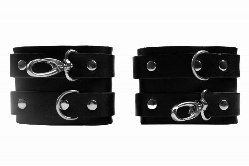 Наножники — один из популярных аксессуаров в БДСМ-практике. Они позволяют ограничить подвижность партнера, сделав его покорным рабом в руках умелого господина, а также помогают зафиксировать тело в позе, удобной для секса. Наножники выполнены из прочной плотной натуральной кожи, надежно фиксируются ремнями с металлическими пряжками. Аксессуары соединяются двумя карабинами между собой. Ремни зафиксированы на наножниках металлическими клепками. Брутальные наножники для ценителей жесткой и сильной фиксации. Обхват наножников - 28 см., ширина - 7 см. Ширина ремешков - 2 см.