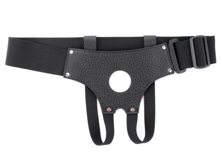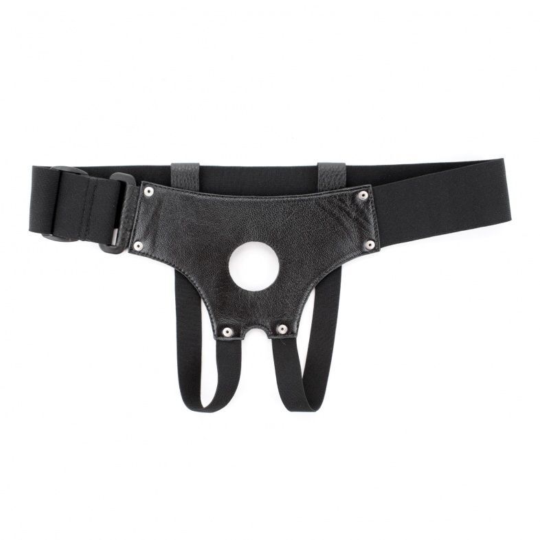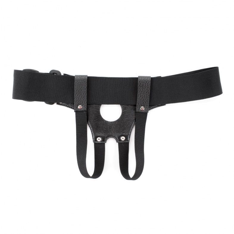 Трусики выполнены из натуральной кожи черного цвета с элементами из черных эластичных резинок, надежно фиксирующих изделие на теле. Трусики-джоки обеспечивают доступ к интимным зонам. Размер удобно регулируется, подойдет на 42-46. Максимально комфортный аксессуар разнообразит любую БДСМ игру. Диаметр отверстия для страпона - 4 см. Ширина резинки на поясе - 5 см.